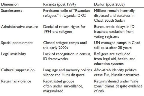 This study essentially engages the post-genocide geography of Rwanda and Sudan in order to describe how displacement turns into a site of erasure instead of refuge. In each instance, the wake of mass atrocities was not marked by reparation or reintegration, but by the entrenchment of political regimes that persisted in marginalizing, monitoring, and silencing survivor populations. Whether through the Great Lakes’ exile of Hutu communities or Darfuri refugees’ decades-long confinement in Chad, genocide’s borderlands have been maintained as spaces of chronic violence. Borrowing from literature that challenges state-led and episodic definitions of genocide (Manby, 2011; Patterson, 1982), this note calls for a reconceptualization of forced migration as a part of the genocidal continuum, a type of harm that persists in law, space, and identity.