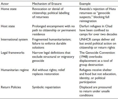 This concept of genocide expands the idea of process rather than a single-event focused and reveals the extent to which structural violence continues to operate well beyond the point where acts of mass killing have ceased. All too frequently, the very institutions intended to protect survivors become vehicles for variants of erasure. Legal erasure encompasses not only the non-recognition or failure to register individuals as displaced persons but also the active withdrawal of citizenship as an exclusionary political measure. Physical containment, such as confining refugees to closed or isolated camps, reinforces the condition of “bare life” (Agamben, 1998), where displaced people are marginalized and controlled with no rights. The refusal of return, commonly justified on “national security” or “reconciliation” grounds, then becomes a policy of exclusion that hides political purpose under humanitarian and legal language.