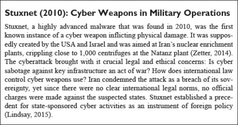 Schmitt, M. N. (2013). The international law of cyber warfare. In M. E. O’ Connell (Ed.), International law and the use of force: A case-based approach (pp. 257–279). Cambridge University Press.